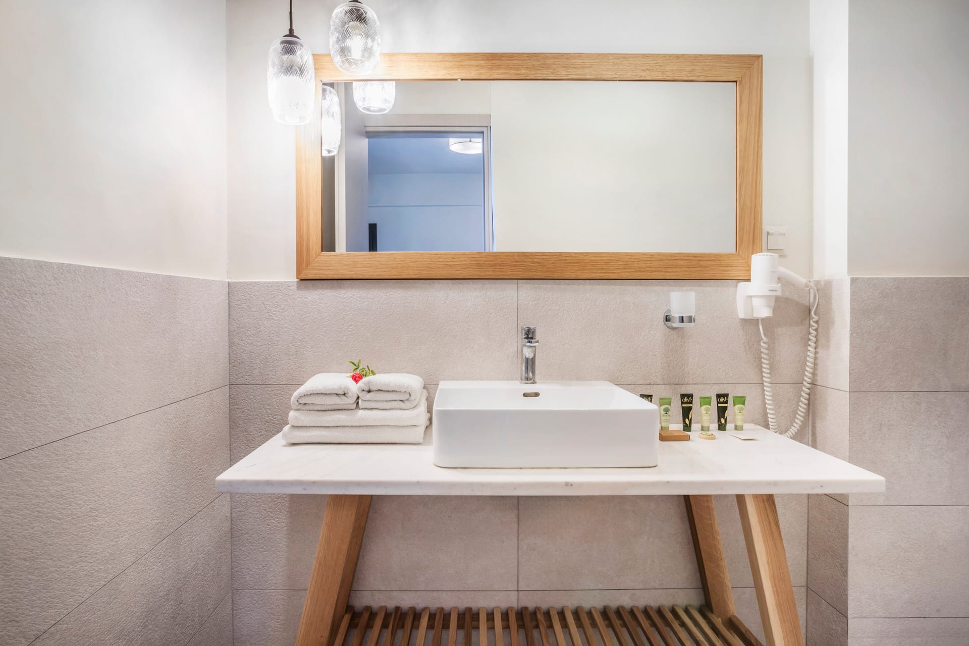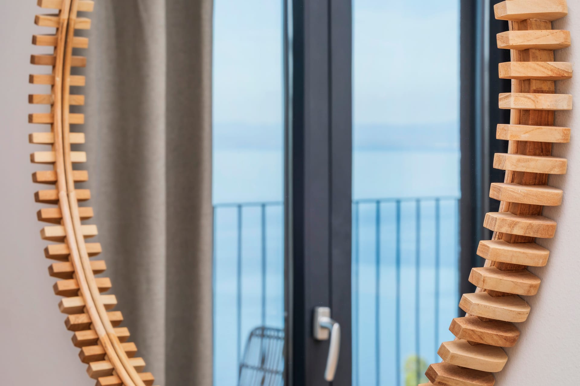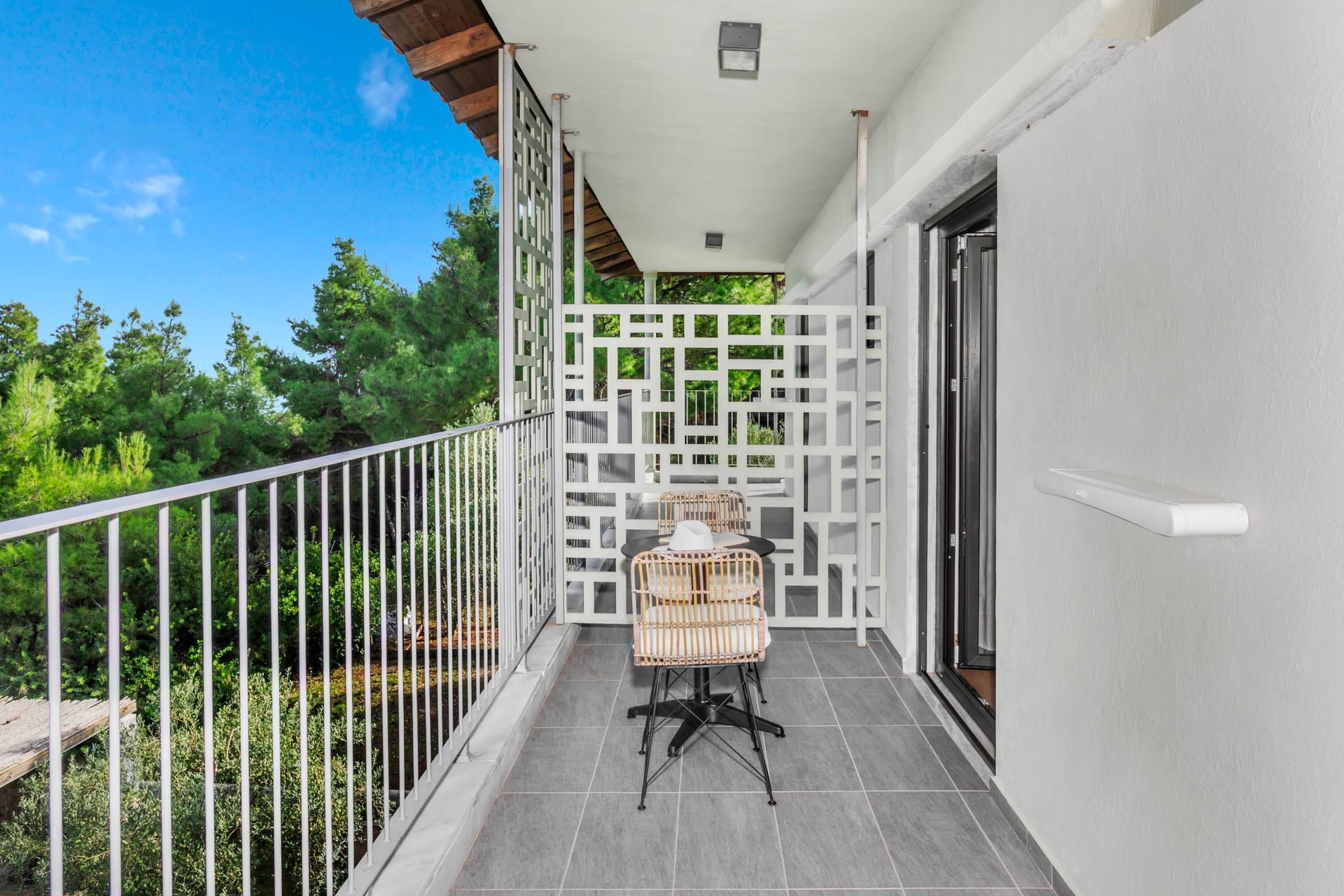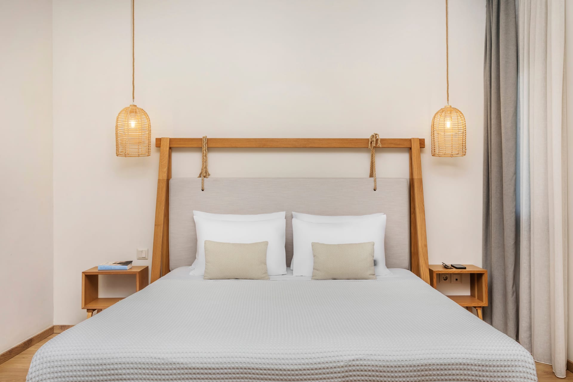 The Superior rooms offer direct sea view from its private balcony. It offers stunning views of the Aegean sea, with special decoration made with care and attention to each detail and equipped with the finest amenities is ready to meet all your needs and satisfy your requirements. Balcony with bohemian style furniture including table, two chairs and sun loungers. Standard capacity for Superior room is 2 persons.